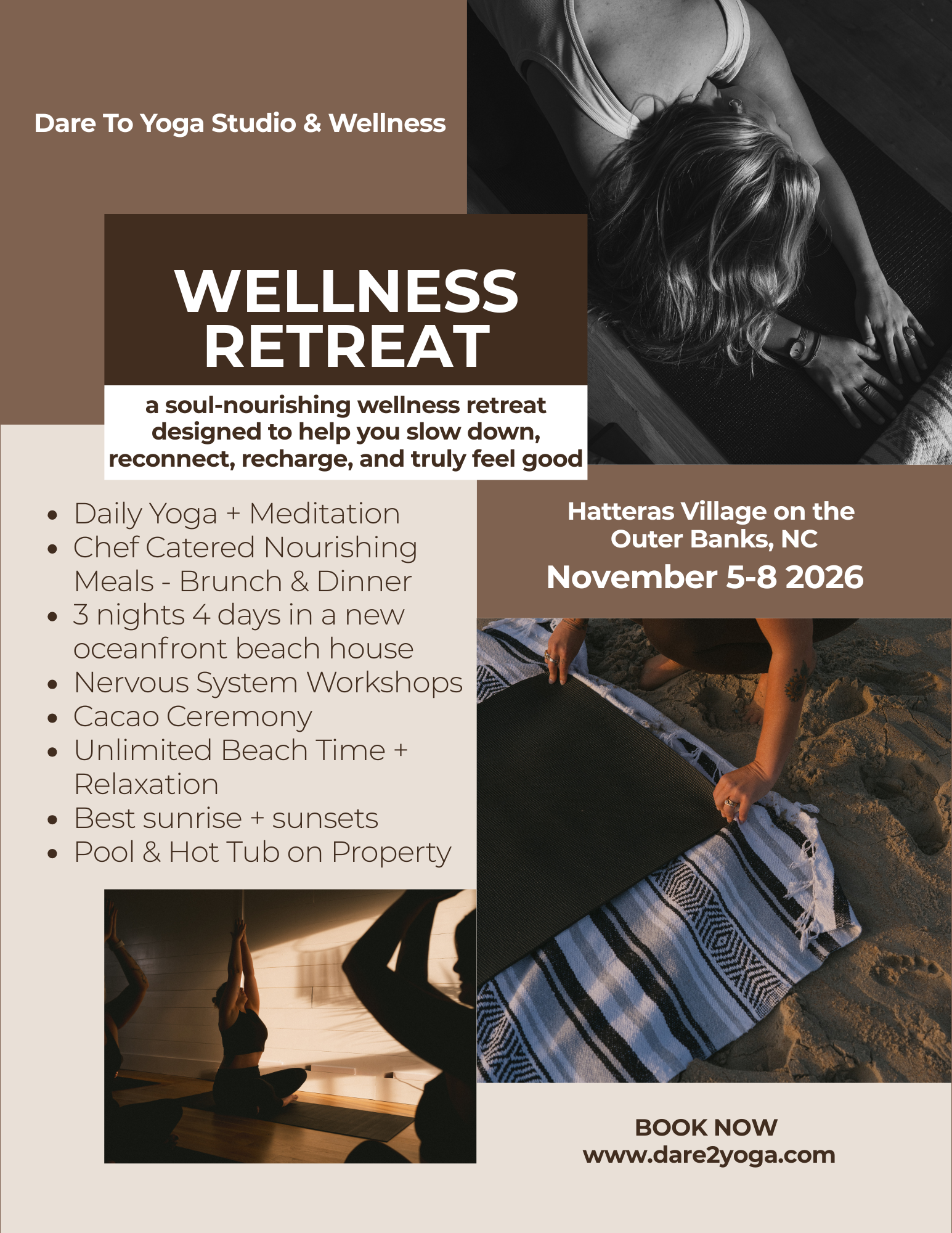 Imagine waking up to the sound of the ocean, sunlight pouring into your bedroom, and nowhere to be except exactly where you are. This November, join us in Hatteras Village on the Outer Banks for a soul-nourishing wellness retreat designed to help you slow down, reconnect, and truly feel good.